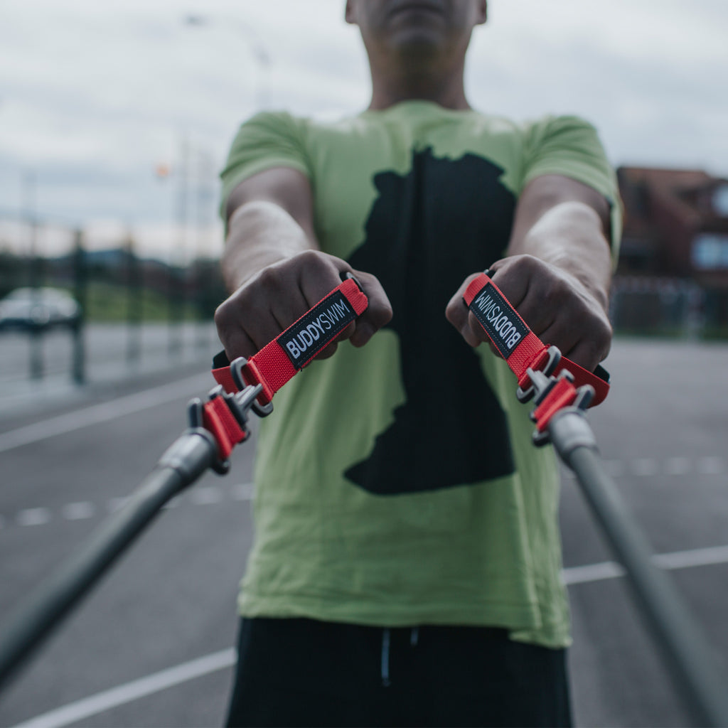 Buddyswim Resistance Rubbers with Interchangeable Paddles and Levers are designed for performing dry swimming exercises. Out-of-water swimmer workouts are an essential supplement to improve stroke endurance and technique. Thanks to the possibility of using paddles or levers, the swimmer can perform an infinity of exercises out of the water such as rotations, pulls, extensions, strength exercises, and many more.